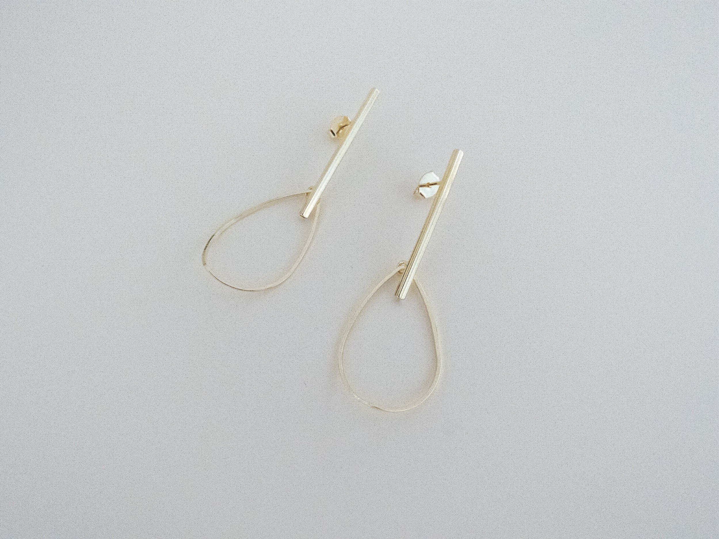 Brinco com palito e gota aberta pendurada. Fechamento em tarracha. Banhado a ouro 18k.