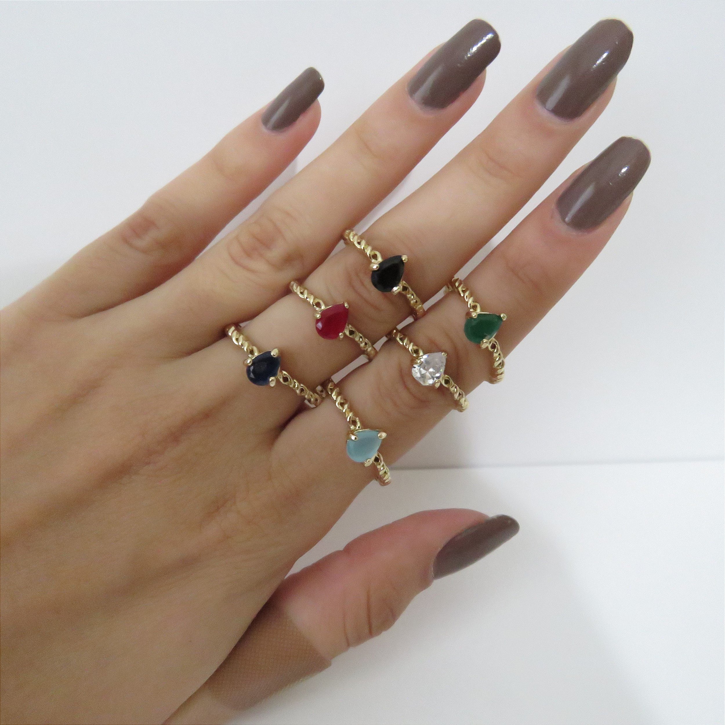 Anel pedra gota ao centro com lateral trabalhada, banhado a ouro 18k.