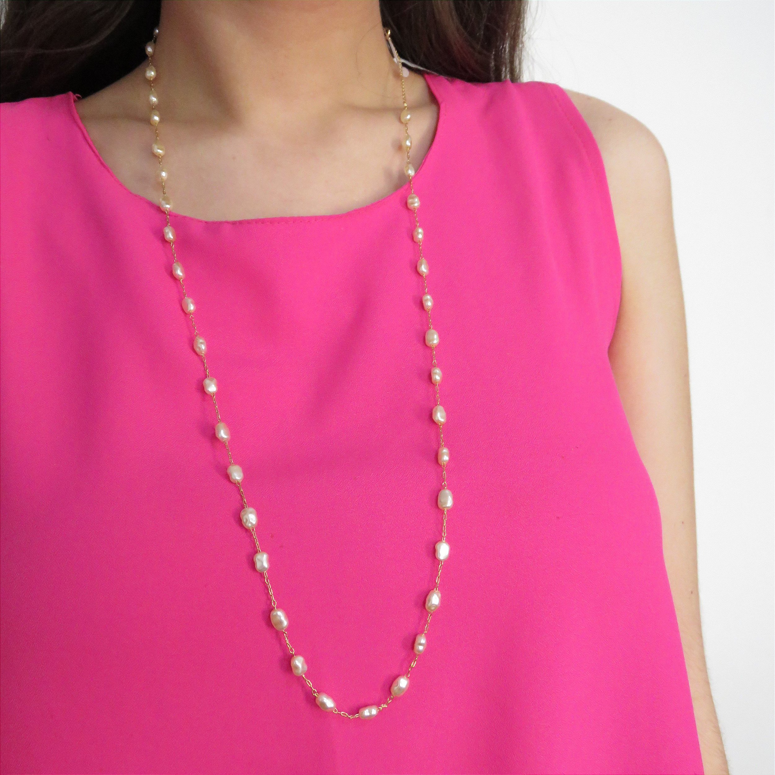 Cordão longo de pérolas irregulares. Banhado a ouro 18k.