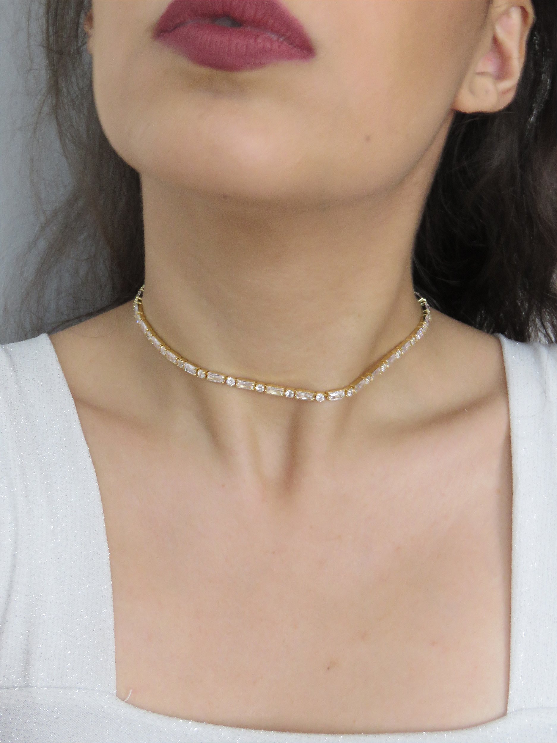 Choker riviera pedra retangular zircônias. Banhada a ouro 18k.