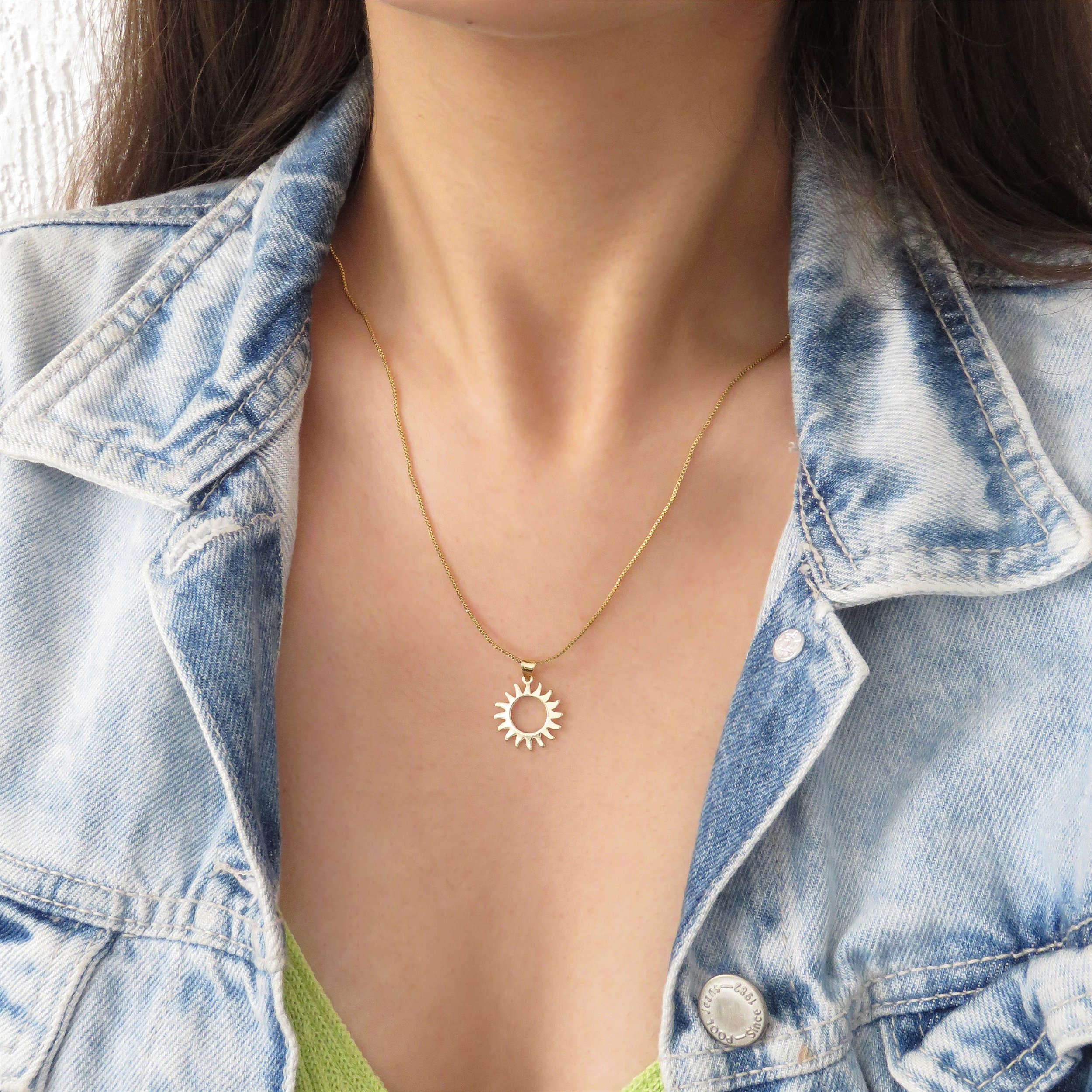 Colar em formato de sol. Na corrente veneziana. Banhado a ouro 18k.