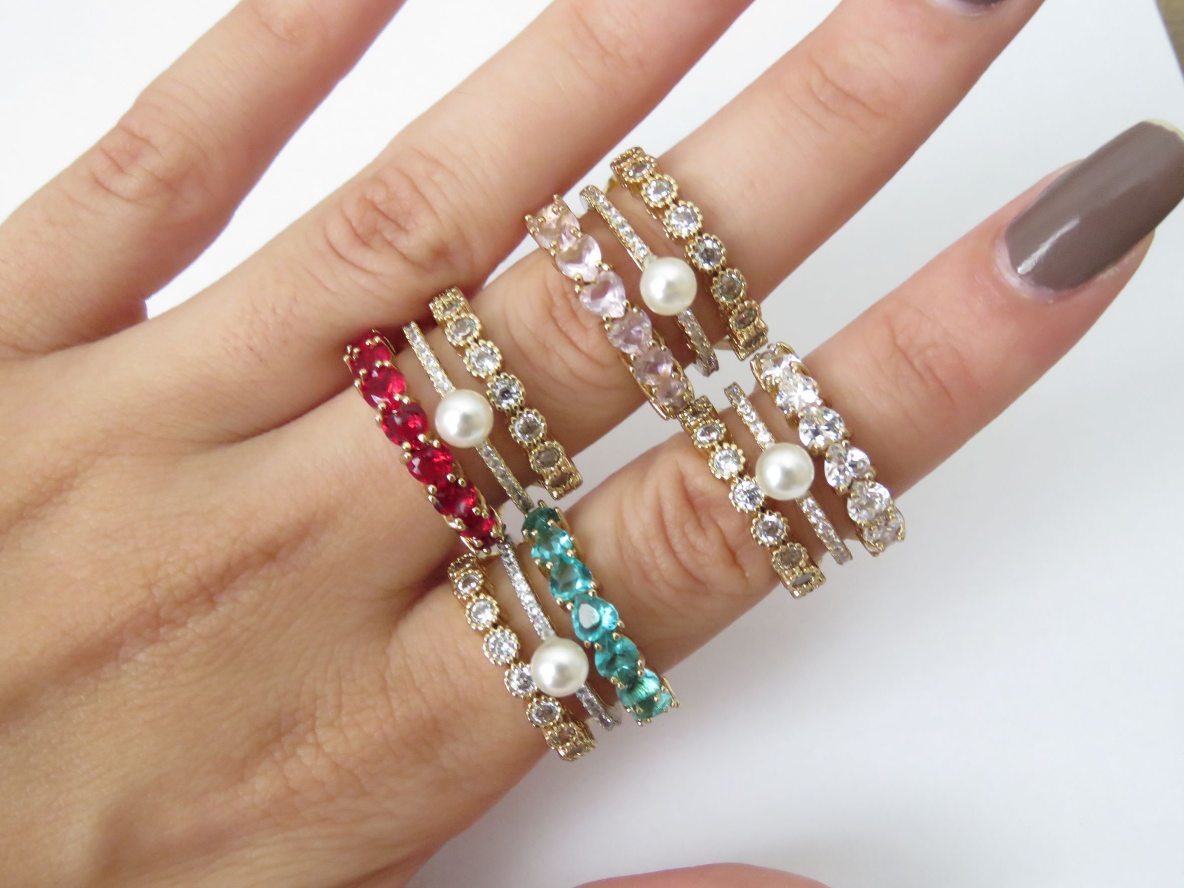 Anel estilo trio fixo, com pedras, zircônias cravejadas e pérola ao centro, banhado a ouro 18k.